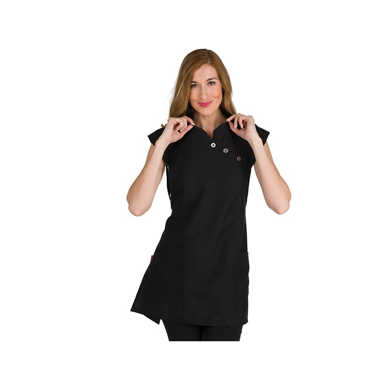 Estola cuello mao, con corchetes metálicos a presión, mini manga, delante con costadillos y bolsillos,
