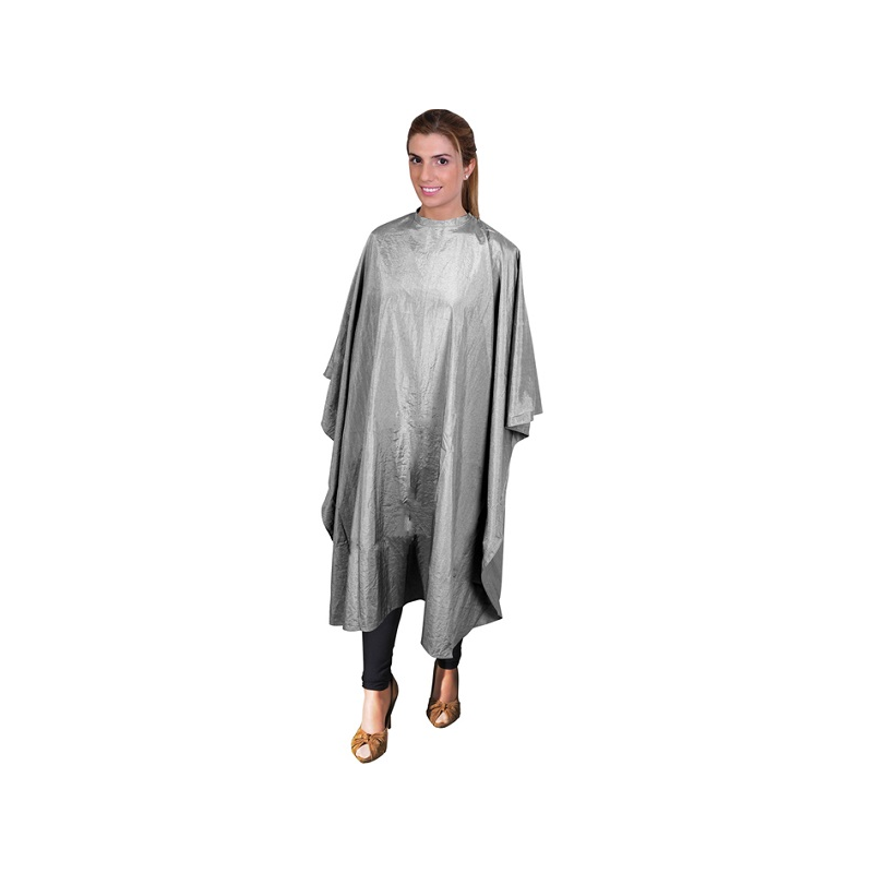 Capa de corte de nylon en color gris con cierre de corchetes.