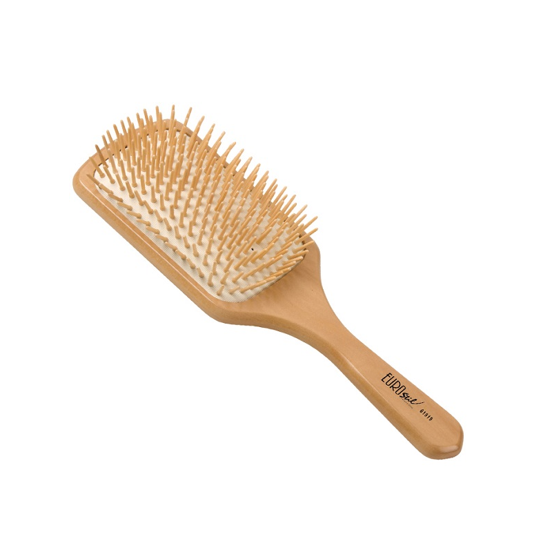 Cepillo de fuelle grande con mango de madera. La púa de madera actúa en el cuero cabelludo,