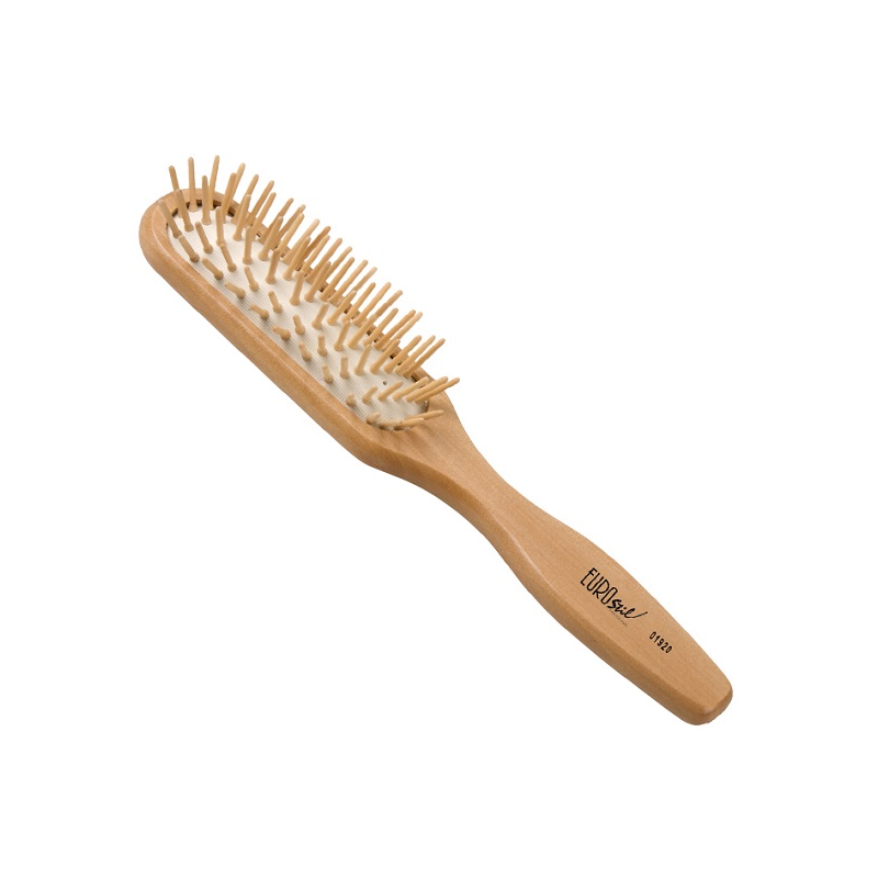 Cepillo de fuelle pequeño con mango de madera. La púa de madera actúa en el cuero cabelludo,