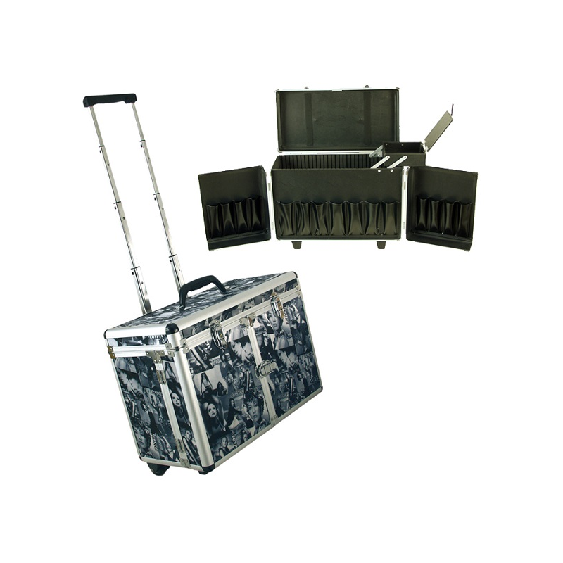 Maleta de aluminio de 47x24x33 cms. decorada. Con ruedas y asa regulable en altura.