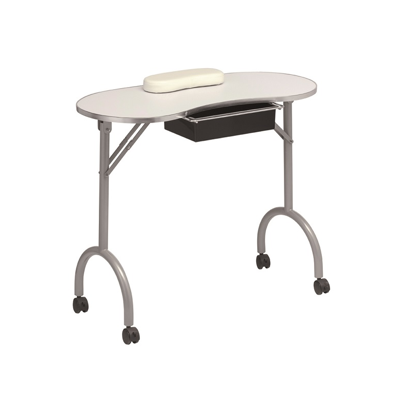 Mesa de manicura con cajón y cojín. Estructura de madera en color blanco. Patas de acero con
