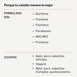 Technology para hidratar sin apelmazar y sellar la cutícula durante cinco lavados. Hace que el cabello brille al instante, reduce la