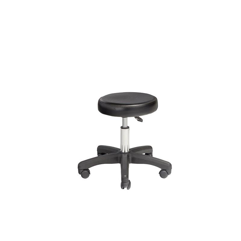 Taburete sin respaldo tapizado en poli piel de color negro. Pistón de gas cromado. Base de nylon